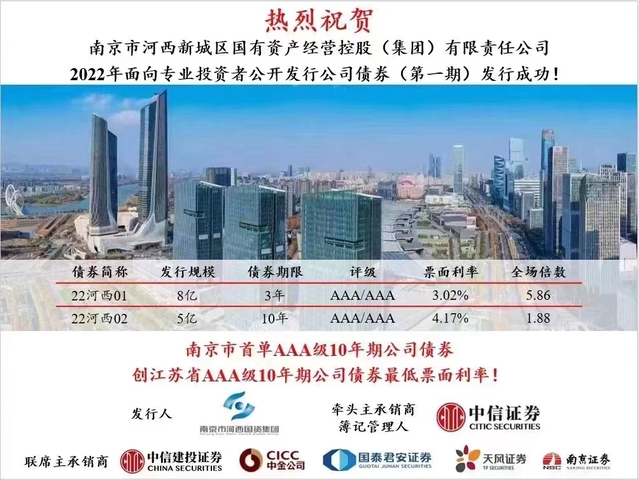 本次發(fā)行為批文下首期發(fā)行,由中信證券擔任牽頭主承銷商及簿記管理人,在主承銷商的共同努力下獲得了圓滿成功。本次發(fā)行獲得了市場投資者的高度認可,體現(xiàn)了投資人對河西集團未來業(yè)務發(fā)展的強烈信心!本次發(fā)行的10年期品種,亦為南京市首單10年期公司債券。河西集團本次發(fā)行10年期公司債券,以較低的融資成本鎖定了長期的資金需求,充分體現(xiàn)河西集團對市場時機的準確把握以及對直融市場融資工具成熟的使用能力,為債券市場作出了積極的示范效應。