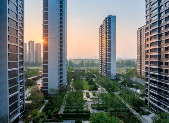 小區(qū)以1300平方米的陽光草坪為核心,烏桕林、櫻花林與低矮灌木穿插其間,形成“花葉共賞、四季生機(jī)”的浪漫花廊;烏桕林與水景水系則構(gòu)成“水榭林間”中央景觀軸,融入生態(tài)草坪設(shè)計,增強(qiáng)了居民與自然的互動體驗。